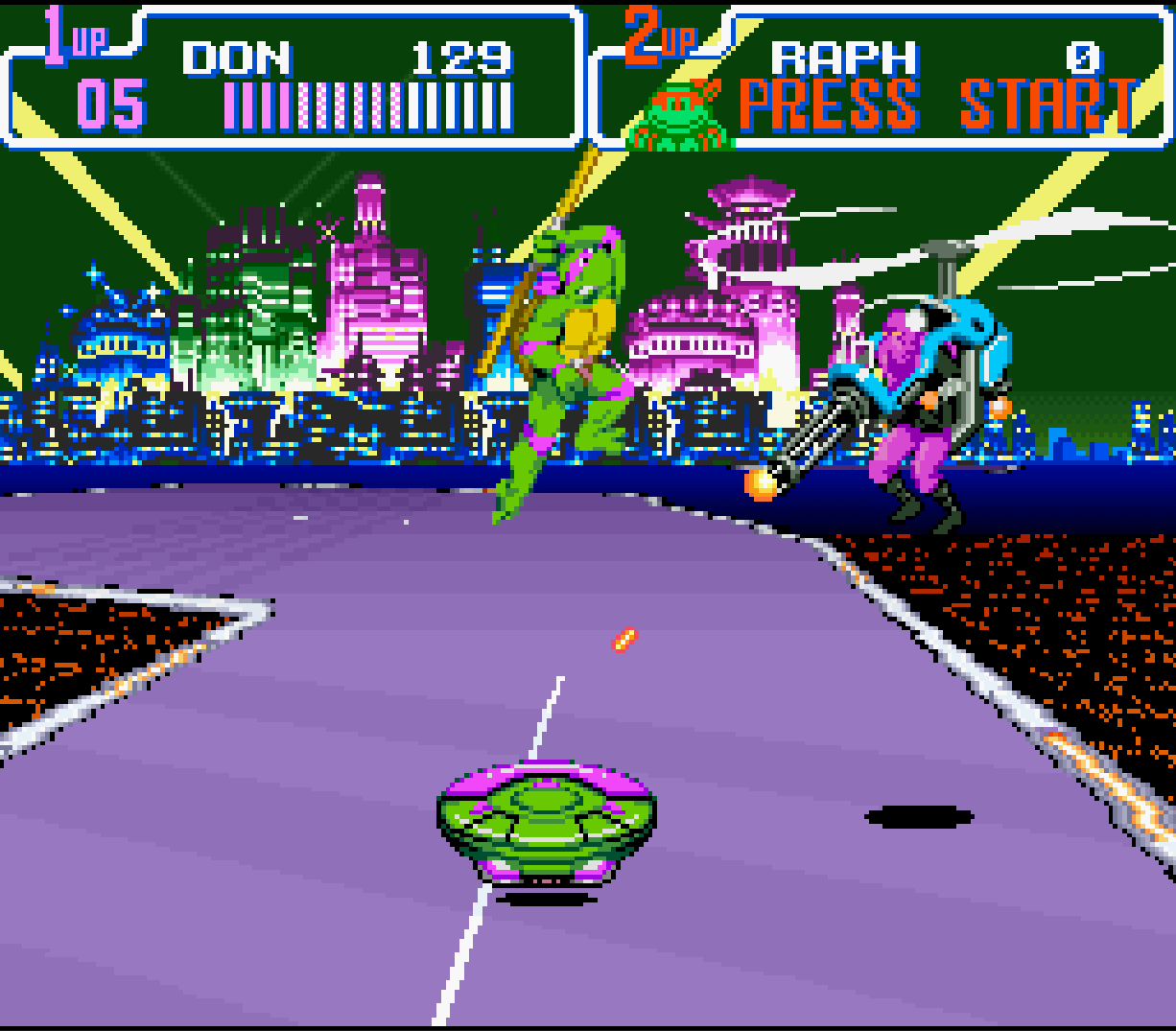 Then there’s the backgrounds. Not solely are the SNES recreation’s phases extra attention-grabbing and assorted, however the Genesis ones are weirdly stagnant. The SNES’s sewer stage takes place on these bizarre hoverboards, skimming throughout the water. The Genesis recreation reuses the identical background for its sewer stage, nevertheless it takes place on foot, the place the turtles and enemies actually stroll round on high of the water. There’s no splash impact round anybody’s toes. It simply seems bizarre.