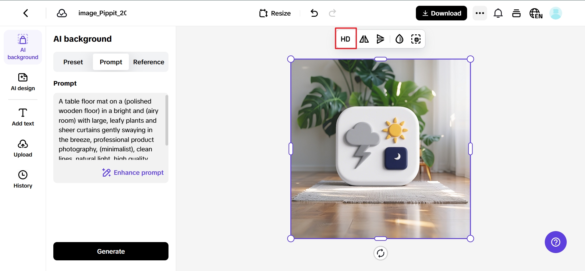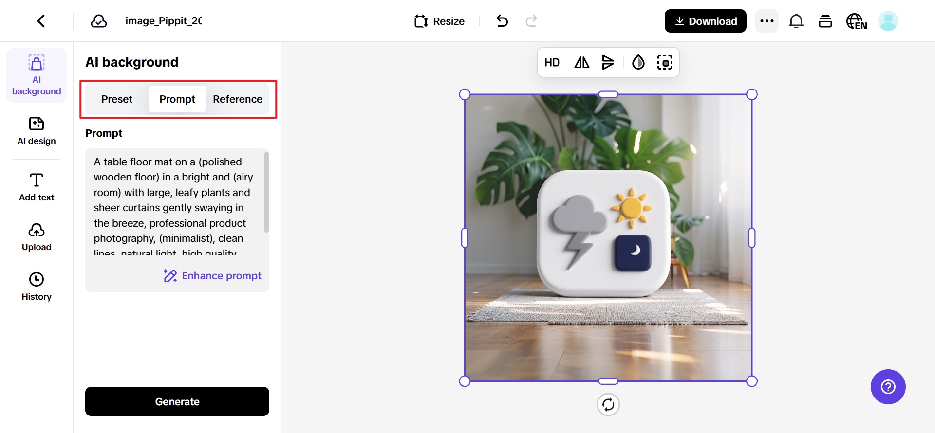 AI Background device will routinely take away the background. Go to Preset now and select a background, click on Reference so as to add your individual, or select Immediate to create one with AI. You’ll be able to equally use the Gross sales Poster to create promotional materials or Add Textual content so as to add captions onto your pictures.