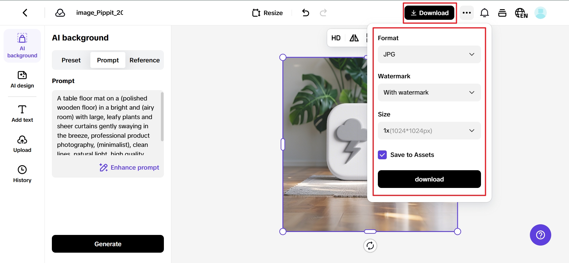 Lastly, click on Obtain on the prime right-hand nook of the editor, select the file dimension and format, after which click on Obtain to avoid wasting the product image in your machine. You might also select to avoid wasting the picture with or with no watermark earlier than exporting.